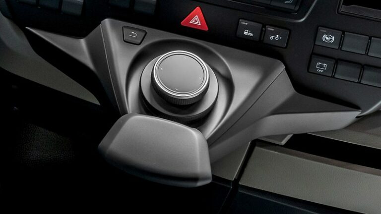 El innovador botón giratorio MAN SmartSelect facilita un control seguro del sistema multimedia, incluso cuando la cabina del conductor se balancea. El cómodo reposamanos garantiza una postura ergonómica mientras que el panel táctil integrado con función de zum facilita la introducción de datos hasta en los terrenos más difíciles.